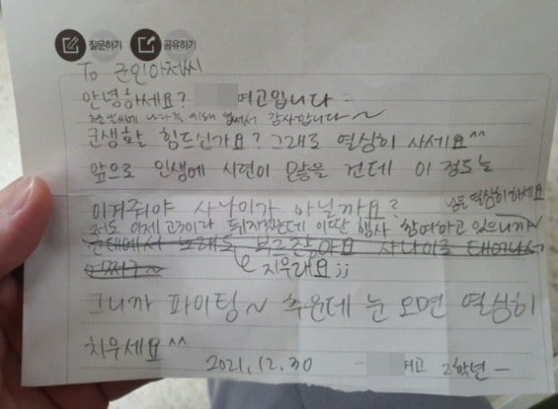 여고생은 “군대에서 노래도 부르잖아요. 사나이로 태어나 어쩌고~”라고 쓴 부분을 지운 후 “지우래요”라고 적었습니다. 그러면서 “그니까 파이팅~ 추운데 눈 오면 열심히 치우세요^^”라고 했는데요.