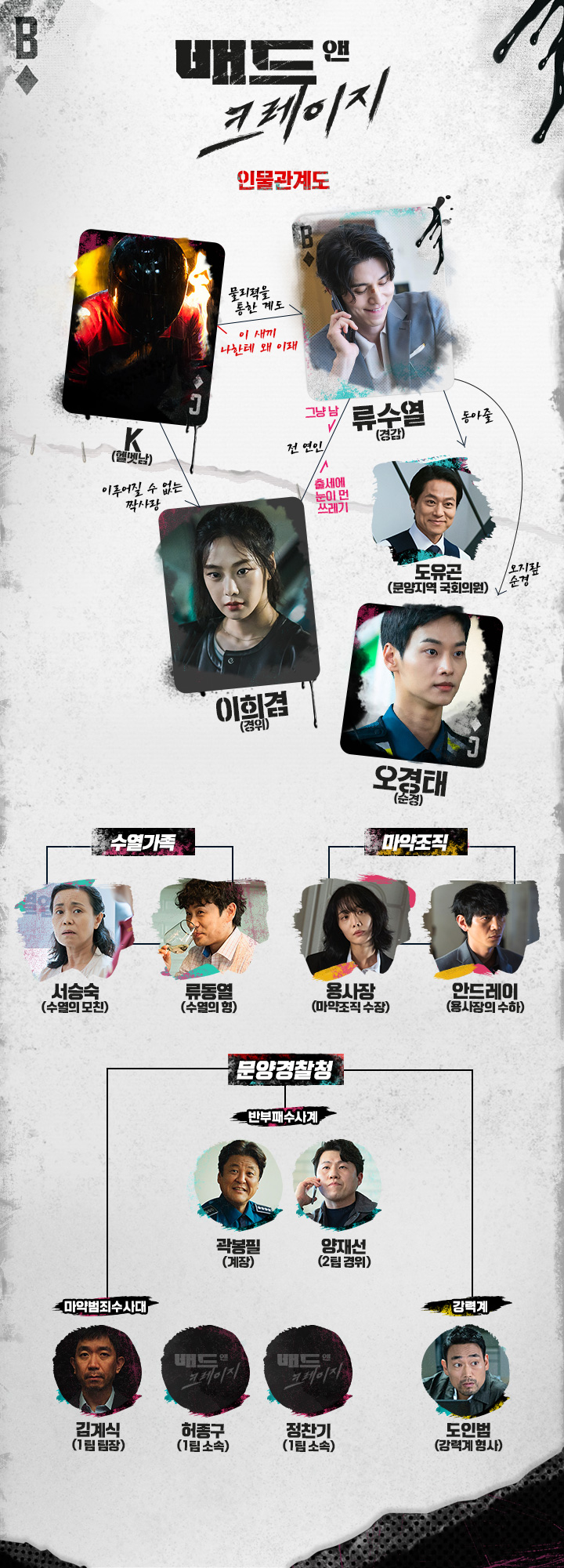배드 앤 크레이지에서 이동욱은 출세지향 결과주의 형사 '류수열'을, 위하준은 미친 정의감의 헬멧남 'K'를, 한지은은 과몰입 담당 마약범죄수사대 경위 '이히겸'을, 차학연은 원칙주의 소향파출소 순경 '오경태'역을 맡아 배앤크를 궁금하게 만듭니다.