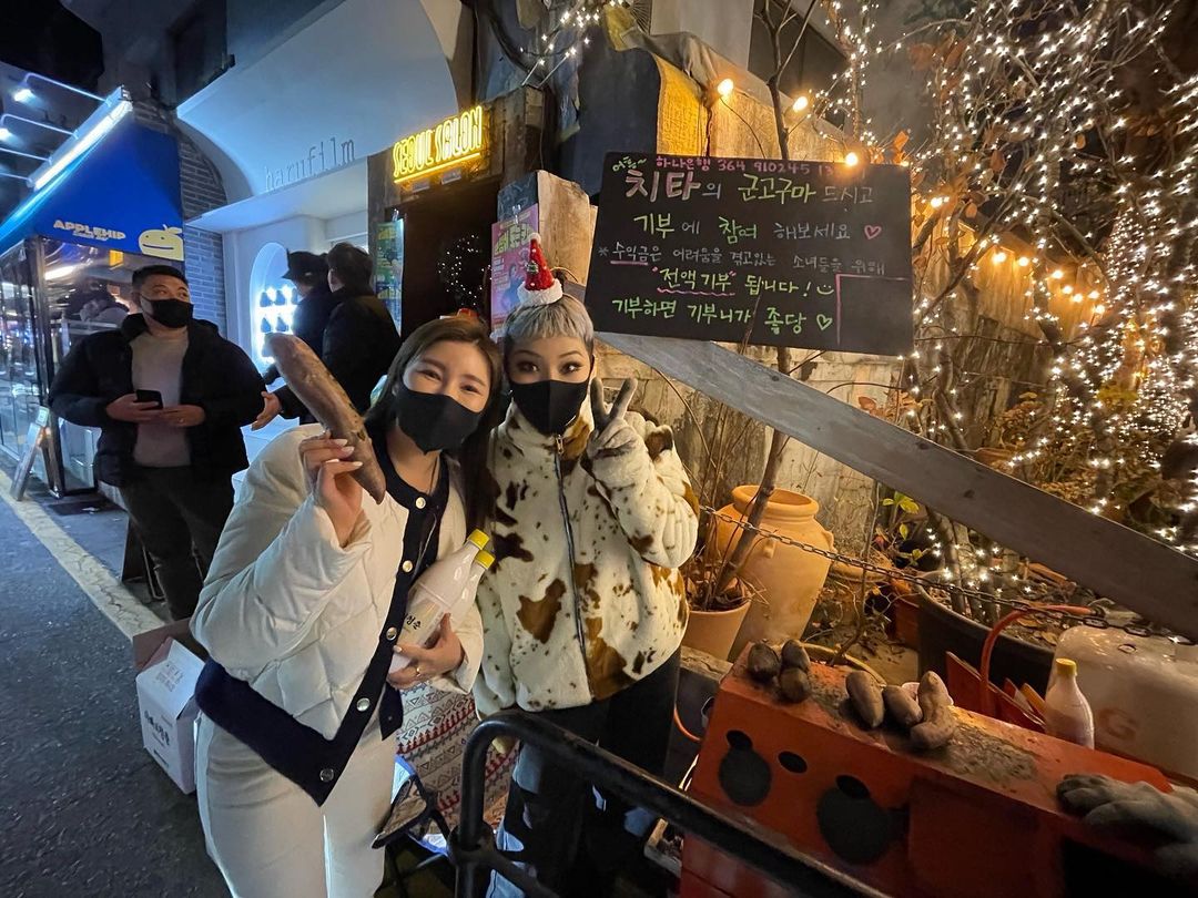 공개된 사진 속 송가인은 가수 치타 옆에서 다정하게 포즈를 취하고 있습니다. 송가인은 한 손엔 기다란 군고구마를, 다른 한 팔엔 막걸리 두 병을 들고 있습니다. 마스크를 뚫고 나오는 송가인과 치타의 행복한 미소가 돋보입니다.